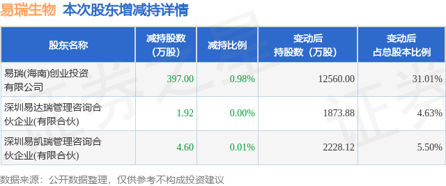 证券之星消息,1月6日易瑞生物发布公告《易瑞生物:关于控股股东及其一致行动人权益变动触及1%整数倍的提示性公告》,其股东易瑞(海南)创业投资有限公司、深圳易达瑞管理咨询合伙企业(有限合伙)、深圳易凯瑞管理咨询合伙企业(有限合伙)于2025年12月5日至2026年1月5日间合计减持403.52万股,占公司目前总股本的0.9962%,变动期间该股股价下跌0.91%,截止1月5日收盘报9.81元。