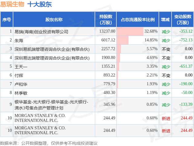 根据易瑞生物2025年三季报公布的十大股东详情如下:
