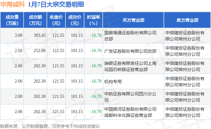 证券之星消息,1月7日华海诚科发生大宗交易,交易数据如下: