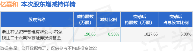 证券之星消息,1月8日亿嘉和发布公告《亿嘉和:亿嘉和科技股份有限公司关于5%以上股东减持至5%以下的权益变动提示性公告》,其股东浙江君弘资产管理有限公司-君弘钱江二十六期私募证券投资基金于2025年12月9日至2026年1月8日间合计减持190.65万股,占公司目前总股本的0.9276%,变动期间该股股价上涨3.97%,截止1月8日收盘报31.97元。