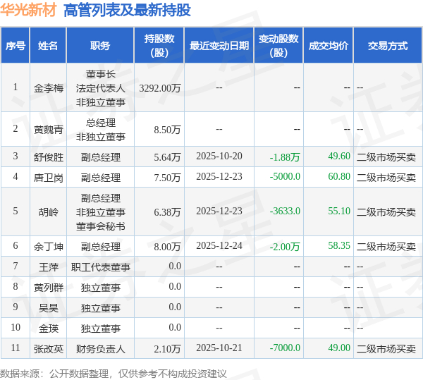 华光新材的高管列表及最新持股情况如下: