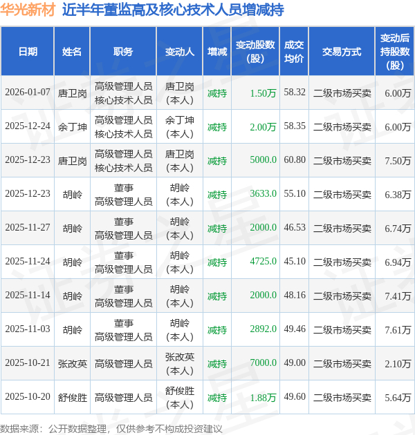 华光新材近半年内的董监高及核心技术人员增减持详情如下: