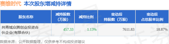 证券之星消息,1月8日赛维时代发布公告《赛维时代:关于持股5%以上股东减持股份触及1%整数倍的公告》,其股东共青城众腾创业投资合伙企业(有限合伙)于2025年12月17日至2026年1月8日间合计减持457.33万股,占公司目前总股本的1.1335%,变动期间该股股价上涨3.44%,截止1月8日收盘报21.35元。