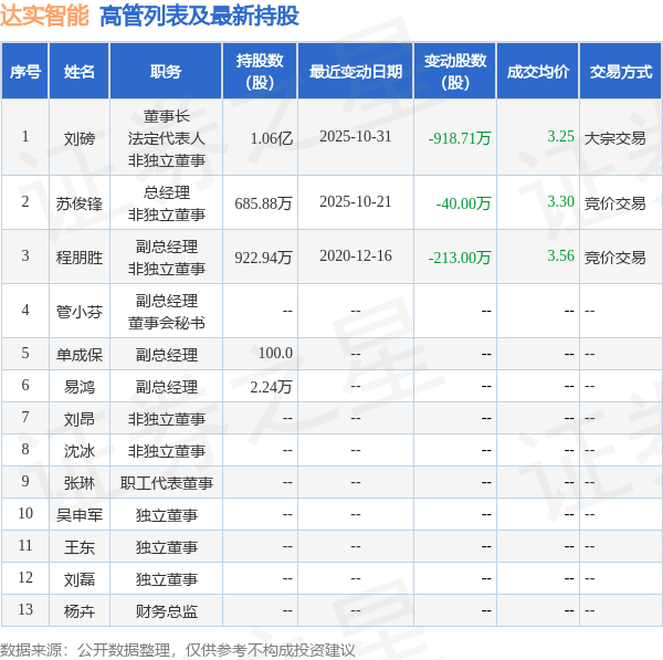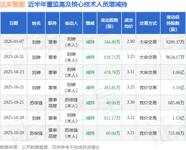 达实智能近半年内的董监高及核心技术人员增减持详情如下: