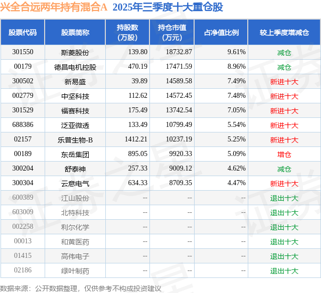 根据2025基金Q3季报公募基金重仓股数据,重仓该股的公募基金共2家,其中持有数量最多的公募基金为兴证全球基金的兴全合远两年持有混合A。兴全合远两年持有混合A目前规模为18.68亿元,最新净值1.0922(1月8日),较上一交易日上涨0.01%,近一年上涨19.0%。该公募基金现任基金经理为吴钊华。