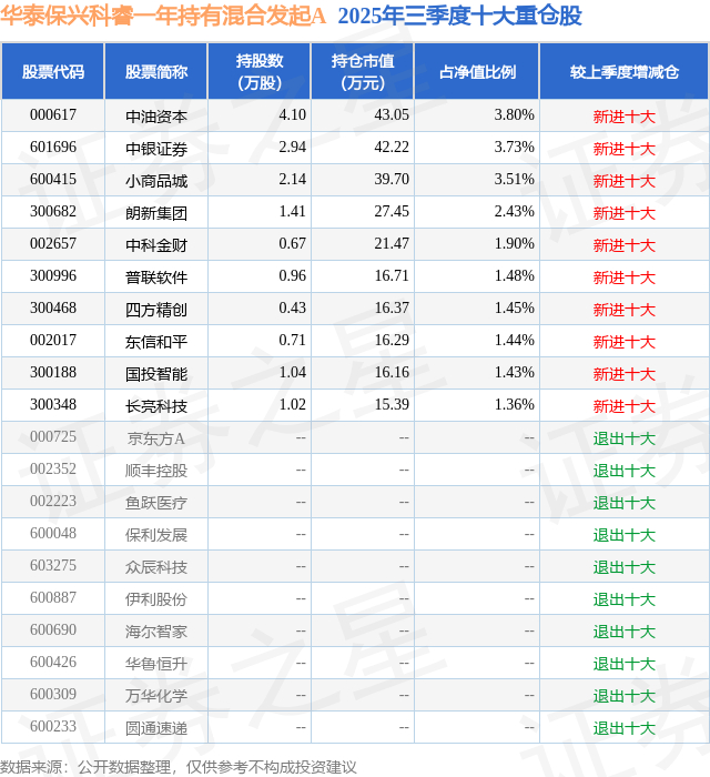 华泰保兴科睿一年持有混合发起A的前十大重仓股如下: