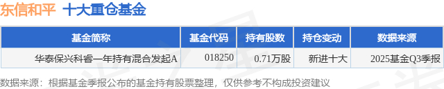 根据2025基金Q3季报公募基金重仓股数据,重仓该股的公募基金共1家,其中持有数量最多的公募基金为华泰保兴基金的华泰保兴科睿一年持有混合发起A。华泰保兴科睿一年持有混合发起A目前规模为0.11亿元,最新净值0.9676(1月8日),较上一交易日上涨0.01%,近一年下跌3.72%。该公募基金现任基金经理为周咏梅 黄俊卿。周咏梅在任的基金产品包括:华泰保兴尊颐定开,管理时间为2018年7月26日至今,期间收益率为31.01%;华泰保兴安盈定开混合,管理时间为2019年5月6日至今,期间收益率为47.39%;华泰保兴科荣混合A,管理时间为2020年5月21日至今,期间收益率为27.11%;华泰保兴久盈63个月定开债,管理时间为2020年8月24日至今,期间收益率为21.6%。黄俊卿在任的基金产品包括:华泰保兴嘉睿3个月持有债券发起A,管理时间为2025年5月8日至今,期间收益率为5.18%;华泰保兴吉年红混合发起A,管理时间为2025年12月31日至今,期间收益率为7.6%。