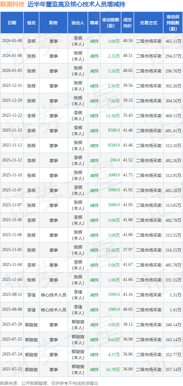 联测科技近半年内的董监高及核心技术人员增减持详情如下: