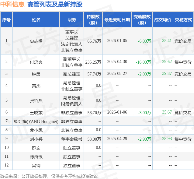 中科信息近半年内的董监高及核心技术人员增减持详情如下: