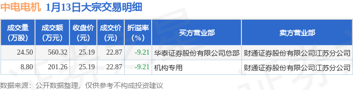 证券之星消息,1月13日中电电机发生大宗交易,交易数据如下: