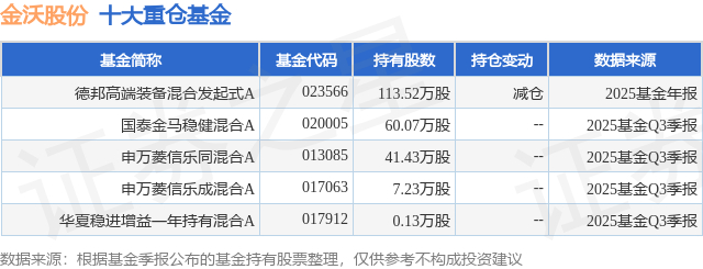根据2025基金年报公募基金重仓股数据,重仓该股的公募基金共1家,其中持有数量最多的公募基金为德邦基金的德邦高端装备混合发起式A。德邦高端装备混合发起式A目前规模为0.61亿元,最新净值1.3094(1月13日),较上一交易日下跌0.96%。该公募基金现任基金经理为陆阳。陆阳在任的基金产品包括:德邦稳盈增长灵活配置混合A,管理时间为2023年10月25日至今,期间收益率为52.41%;德邦鑫星价值灵活配置混合A,管理时间为2024年1月30日至今,期间收益率为284.04%;