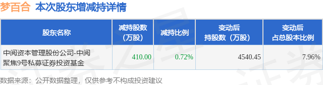 证券之星消息,1月14日梦百合发布公告《梦百合:关于持股5%以上股东权益变动触及1%刻度的提示性公告》,其股东中阅资本管理股份公司-中阅聚焦9号私募证券投资基金于2026年1月8日至2026年1月14日间合计减持410.0万股,占公司目前总股本的0.7186%,变动期间该股股价上涨2.43%,截止1月14日收盘报9.27元。