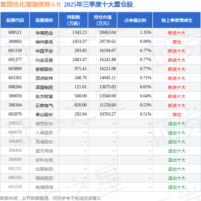 富国优化增强债券A/B的前十大重仓股如下: