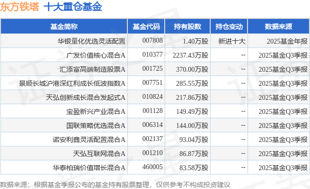根据2025基金年报公募基金重仓股数据,重仓该股的公募基金共1家,其中持有数量最多的公募基金为华银基金的华银量化优选灵活配置。华银量化优选灵活配置目前规模为0.17亿元,最新净值2.3623(1月16日),较上一交易日上涨2.03%,近一年上涨72.36%。该公募基金现任基金经理为程敏。程敏在任的基金产品包括:华银优势行业股票,管理时间为2021年9月27日至今,期间收益率为47.45%。