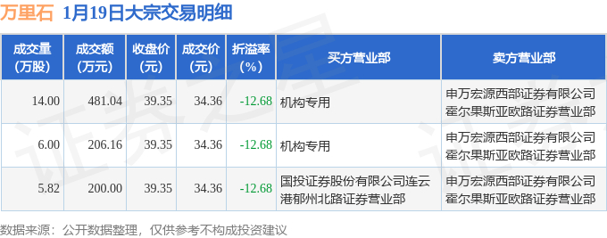 证券之星消息,1月19日万里石发生大宗交易,交易数据如下: