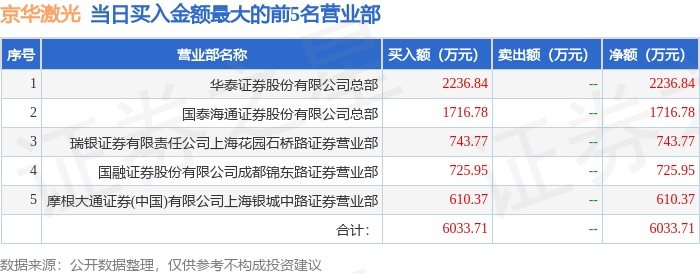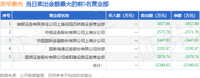 证券之星消息,沪深交易所2026年1月19日公布的交易公开信息显示,京华激光(603607)因有价格涨跌幅限制的日收盘价格跌幅偏离值达到7%的前五只证券登上龙虎榜。此次是近5个交易日内第1次上榜。