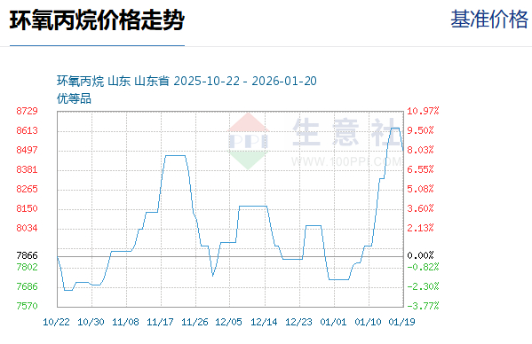 近期,环氧丙烷价格飙升。生意社数据显示,环氧丙烷基准价在1月20日已达到8500元/吨,较本月初(7733.33元/吨)上涨了9.91%,在近一周(1月12日至18日)涨幅更是达到7.9%,领涨化工品市场。