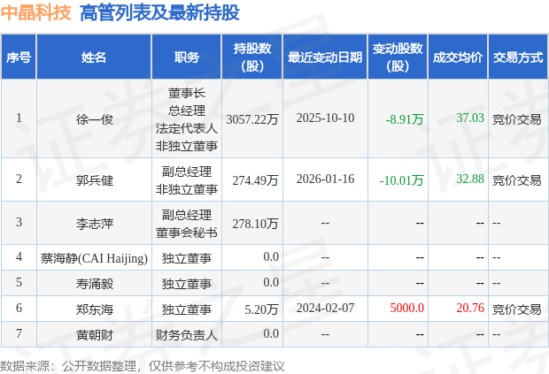 中晶科技的高管列表及最新持股情况如下: