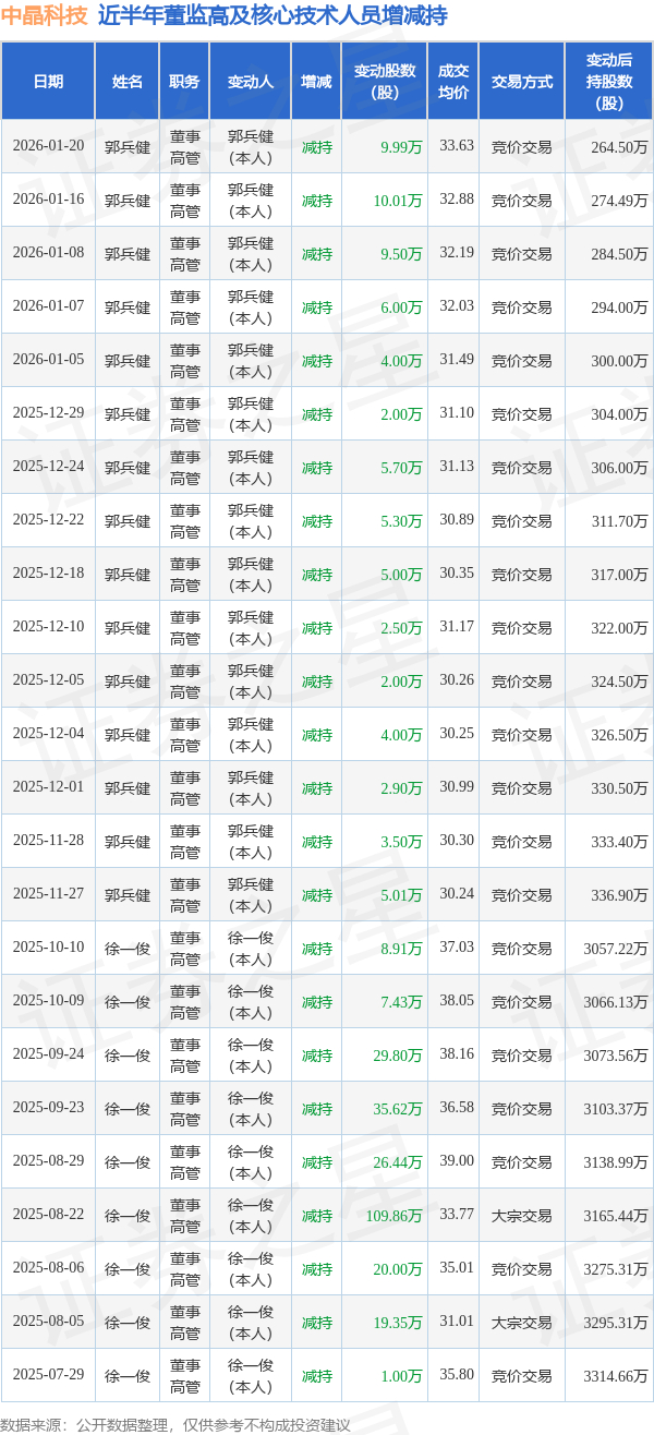 中晶科技近半年内的董监高及核心技术人员增减持详情如下: