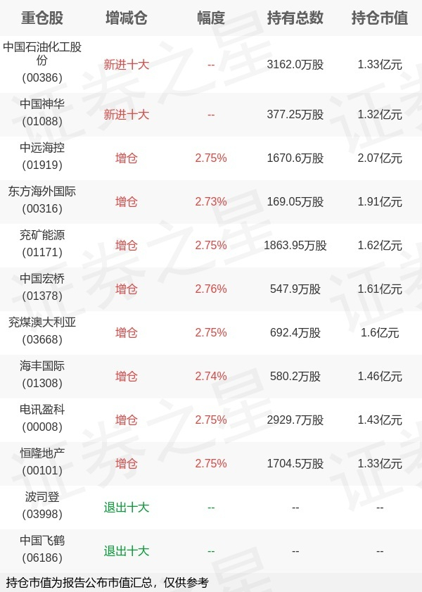 证券之星消息,1月22日博时基金旗下万琼 王萌管理的博时恒生港股通高股息率交易型开放式指数基金公布年报,近1年净值增长率30.15%。与上一季度相比,该基金前十大重仓股新增中国石油化工股份,中国神华;并对中远海控增仓44.7万股,为该基金第一大重仓股;波司登,中国飞鹤等退出前十大重仓股;详细数据如下: