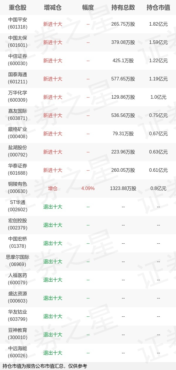 证券之星消息,1月22日博时基金旗下罗霄 江海峰管理的博时稳健增利债券型基金公布年报,近1年净值增长率9.62%。与上一季度相比,该基金前十大重仓股新增中国平安,中国太保,中信证券,国泰海通,万华化学,嘉友国际,藏格矿业,盐湖股份,华泰证券;其中中国平安持仓占比1.46%,为该基金第一大重仓股;ST华通,宏创控股,中国宏桥,思摩尔国际,人福医药,盛达资源,华友钴业,豆神教育,中远海能等退出前十大重仓股;详细数据如下: