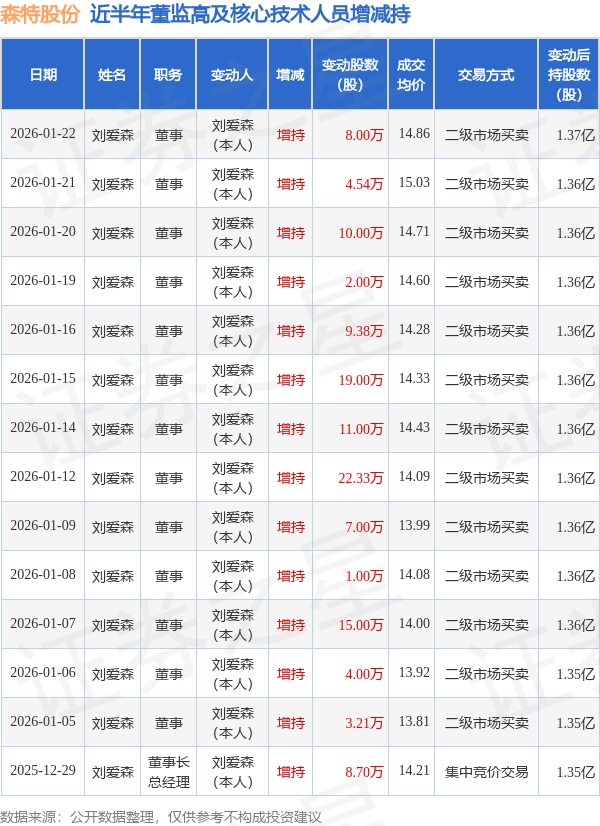 森特股份近半年内的董监高及核心技术人员增减持详情如下: