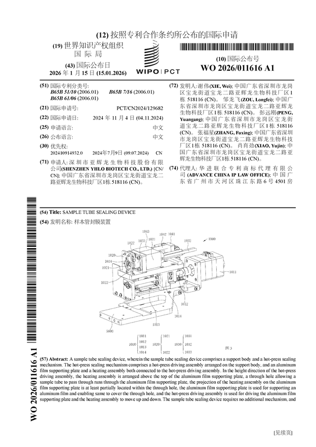 证券之星消息,根据企查查数据显示亚辉龙(688575)公布了一项国际专利申请,专利名为“样本管封膜装置”,专利申请号为PCT/CN2024/129682,国际公布日为2026年1月15日。