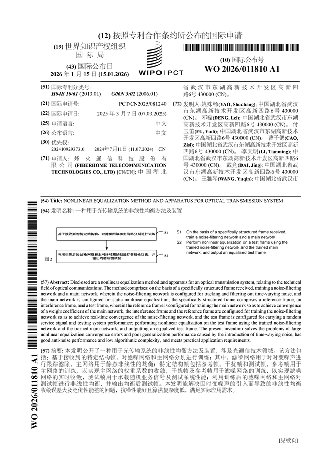 证券之星消息,根据企查查数据显示烽火通信(600498)公布了一项国际专利申请,专利名为“一种用于光传输系统的非线性均衡方法及装置”,专利申请号为PCT/CN2025/081240,国际公布日为2026年1月15日。