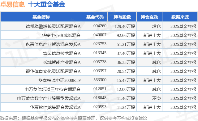 重仓卓易信息的前十大公募基金请见下表: