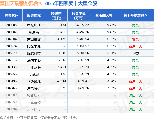 根据2025基金年报公募基金重仓股数据,重仓该股的公募基金共33家,其中持有数量最多的公募基金为富国基金的富国天瑞强势混合A。富国天瑞强势混合A目前规模为38.44亿元,最新净值1.0929(1月23日),较上一交易日下跌0.65%,近一年上涨48.77%。该公募基金现任基金经理为徐智翔。徐智翔在任的基金产品包括:富国新材料新能源混合A,管理时间为2021年11月4日至今,期间收益率为51.04%;富国匠心成长混合A,管理时间为2024年4月30日至今,期间收益率为165.07%。