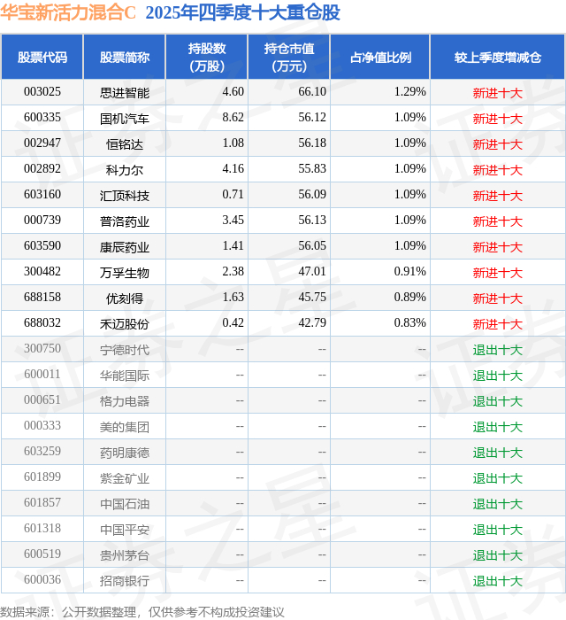 华宝新活力混合C的前十大重仓股如下: