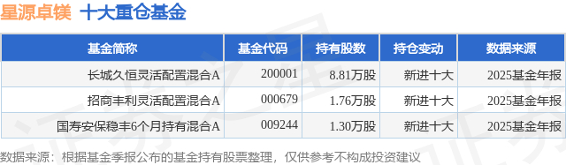 根据2025基金年报公募基金重仓股数据,重仓该股的公募基金共3家,其中持有数量最多的公募基金为长城基金的长城久恒灵活配置混合A。长城久恒灵活配置混合A目前规模为1.01亿元,最新净值2.5073(1月23日),较上一交易日上涨1.31%,近一年上涨57.03%。该公募基金现任基金经理为储雯玉。储雯玉在任的基金产品包括:长城国企优选混合发起式A,管理时间为2023年10月24日至今,期间收益率为26.81%。