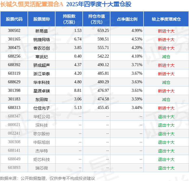 长城久恒灵活配置混合A的前十大重仓股如下: