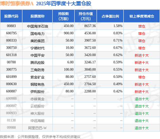 根据2025基金年报公募基金重仓股数据,重仓该股的公募基金共13家,其中持有数量最多的公募基金为博时基金的博时恒泰债券A。博时恒泰债券A目前规模为9.9亿元,最新净值1.1881(1月23日),较上一交易日上涨0.12%,近一年上涨7.81%。该公募基金现任基金经理为张李陵 静鹏 唐薇。张李陵在任的基金产品包括:博时信用债纯债债券A,管理时间为2020年7月13日至今,期间收益率为21.51%;博时恒泽混合A,管理时间为2021年2月8日至今,期间收益率为20.25%;博时博盈稳健6个月持有期混合A,管理时间为2021年8月10日至今,期间收益率为-2.38%。静鹏在任的基金产品包括:博时乐臻定开混合,管理时间为2024年8月13日至今,期间收益率为14.67%;博时恒旭持有期混合A,管理时间为2024年8月13日至今,期间收益率为22.61%;唐薇在任的基金产品包括:博时富鑫纯债A,管理时间为2022年6月15日至今,期间收益率为13.04%;博时慧选纯债定开债,管理时间为2022年9月9日至今,期间收益率为8.96%;博时聚润纯债债券A,管理时间为2024年3月21日至今,期间收益率为4.99%;博时丰达纯债6个月定开债,管理时间为2024年4月9日至今,期间收益率为5.78%。