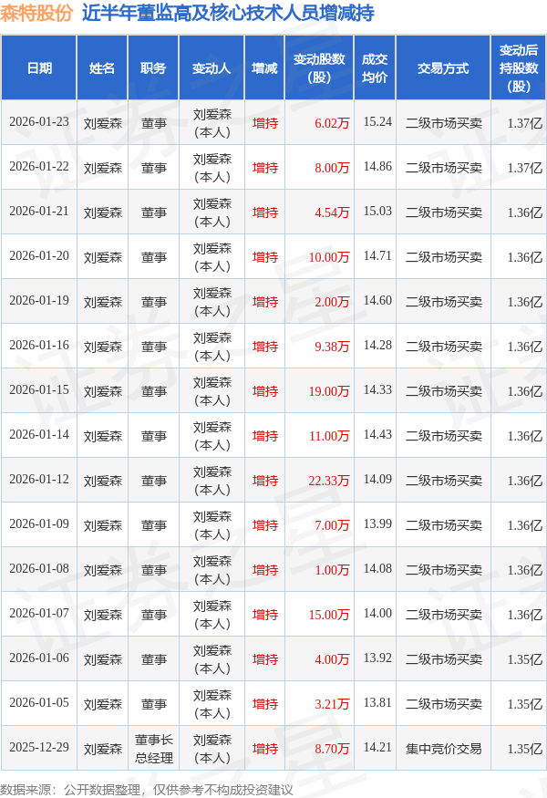 森特股份近半年内的董监高及核心技术人员增减持详情如下: