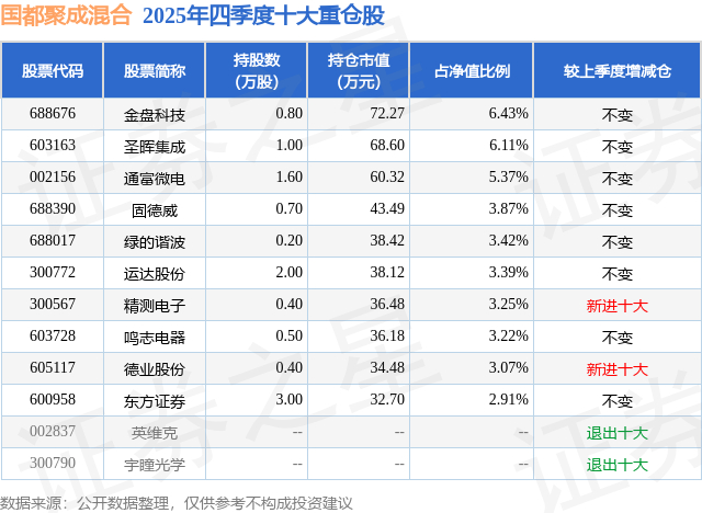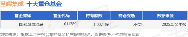 根据2025基金年报公募基金重仓股数据,重仓该股的公募基金共1家,其中持有数量最多的公募基金为国都证券的国都聚成混合。国都聚成混合目前规模为0.11亿元,最新净值0.6488(1月26日),较上一交易日下跌0.87%,近一年上涨33.91%。该公募基金现任基金经理为张晓磊 龚勇进。张晓磊在任的基金产品包括:国都创新驱动,管理时间为2023年3月10日至今,期间收益率为-15.54%;