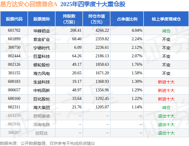 根据2025基金年报公募基金重仓股数据,重仓该股的公募基金共25家,其中持有数量最多的公募基金为易方达基金的易方达安心回馈混合A。易方达安心回馈混合A目前规模为9.05亿元,最新净值2.724(1月26日),较上一交易日下跌0.33%,近一年上涨14.6%。该公募基金现任基金经理为李中阳。李中阳在任的基金产品包括:易方达丰华债券A,管理时间为2021年7月8日至今,期间收益率为13.4%;易方达悦稳一年持有混合A,管理时间为2022年3月15日至今,期间收益率为14.06%;