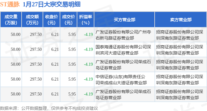 证券之星消息,1月27日ST通脉发生大宗交易,交易数据如下: