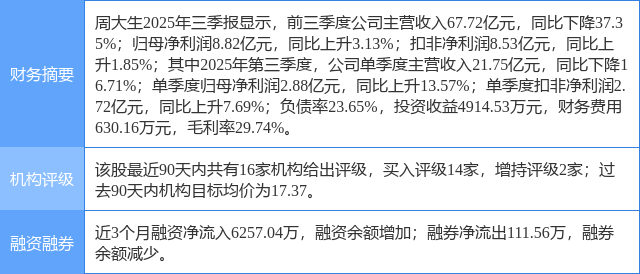 今日周大生(002867)涨8.17%,收盘报14.04元。