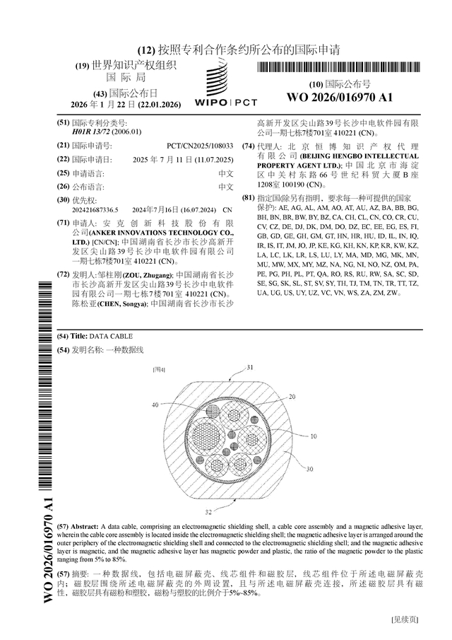 证券之星消息,根据企查查数据显示安克创新(300866)公布了一项国际专利申请,专利名为“一种数据线”,专利申请号为PCT/CN2025/108033,国际公布日为2026年1月22日。