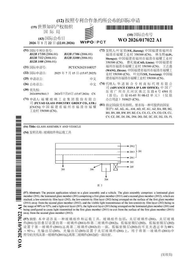 证券之星消息,根据企查查数据显示福耀玻璃(600660)公布了一项国际专利申请,专利名为“玻璃组件和运载工具”,专利申请号为PCT/CN2025/108527,国际公布日为2026年1月22日。