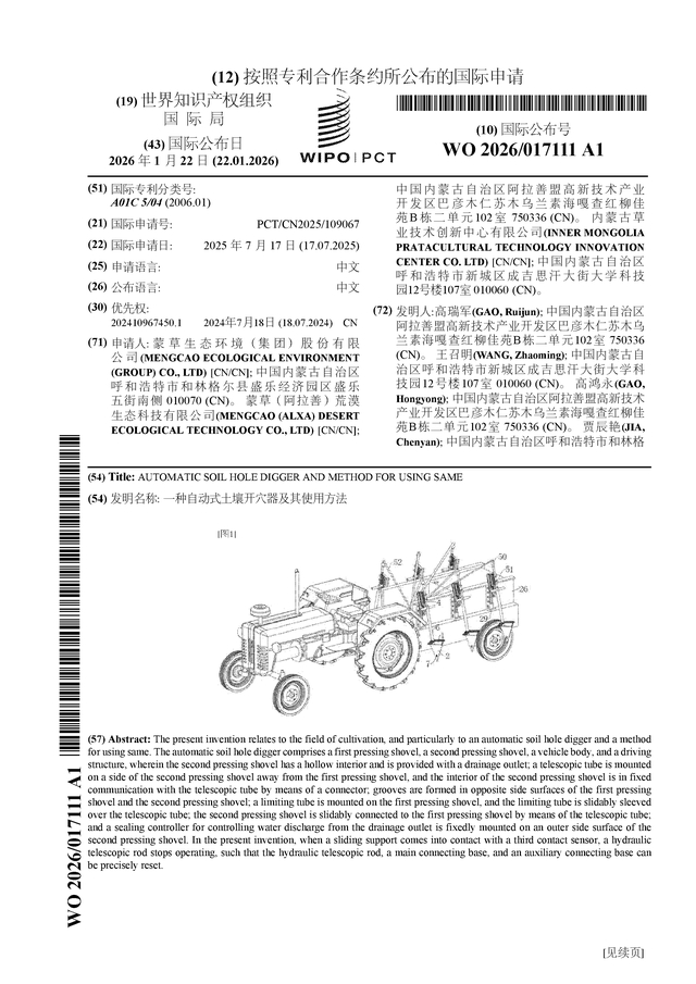 证券之星消息,根据企查查数据显示蒙草生态(300355)公布了一项国际专利申请,专利名为“一种自动式土壤开穴器及其使用方法”,专利申请号为PCT/CN2025/109067,国际公布日为2026年1月22日。