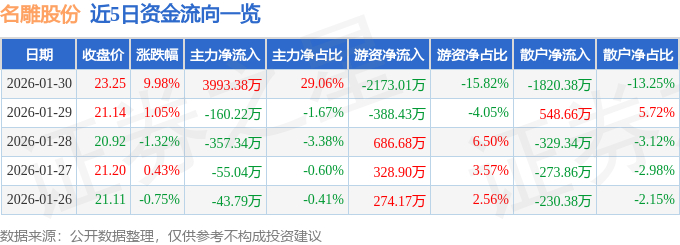 1月30日的资金流向数据方面,主力资金净流入3993.38万元,占总成交额29.06%,游资资金净流出2173.01万元,占总成交额15.82%,散户资金净流出1820.38万元,占总成交额13.25%。