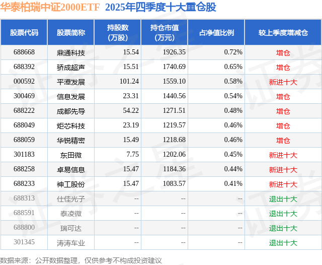根据2025基金年报公募基金重仓股数据,重仓该股的公募基金共4家,其中持有数量最多的公募基金为华泰柏瑞基金的华泰柏瑞中证2000ETF。华泰柏瑞中证2000ETF目前规模为26.75亿元,最新净值1.4953(1月29日),较上一交易日下跌1.42%,近一年上涨48.7%。该公募基金现任基金经理为柳军 李沐阳。柳军在任的基金产品包括:华泰柏瑞上证红利ETF,管理时间为2009年6月4日至今,期间收益率为150.34%;华泰柏瑞沪深300ETF,管理时间为2012年5月4日至今,期间收益率为121.99%;华泰柏瑞沪深300ETF联接A,管理时间为2012年5月29日至今,期间收益率为138.77%;华泰MSCI中国A股国际通ETF,管理时间为2018年4月26日至今,期间收益率为90.47%。李沐阳在任的基金产品包括:华泰柏瑞中证光伏产业ETF,管理时间为2021年1月6日至今,期间收益率为-8.91%;华泰柏瑞光伏ETF联接A,管理时间为2021年8月17日至今,期间收益率为-33.24%;华泰柏瑞中韩半导体ETF(QDII),管理时间为2022年11月2日至今,期间收益率为216.72%;华泰柏瑞纳斯达克100ETF(QDII),管理时间为2023年3月1日至今,期间收益率为108.5%。