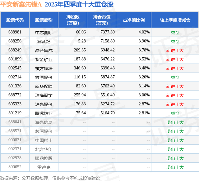 根据2025基金年报公募基金重仓股数据,重仓该股的公募基金共17家,其中持有数量最多的公募基金为平安基金的平安新鑫先锋A。平安新鑫先锋A目前规模为8.29亿元,最新净值3.076(1月29日),较上一交易日下跌1.5%,近一年上涨55.11%。该公募基金现任基金经理为张晓泉。张晓泉在任的基金产品包括:平安研究精选混合A,管理时间为2021年5月25日至今,期间收益率为51.8%;平安研究优选混合A,管理时间为2023年3月21日至今,期间收益率为56.0%;平安新鑫优选混合A,管理时间为2023年8月15日至今,期间收益率为53.09%。