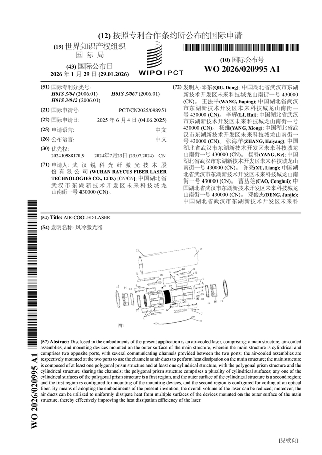 证券之星消息,根据企查查数据显示锐科激光(300747)公布了一项国际专利申请,专利名为“风冷激光器”,专利申请号为PCT/CN2025/098951,国际公布日为2026年1月29日。