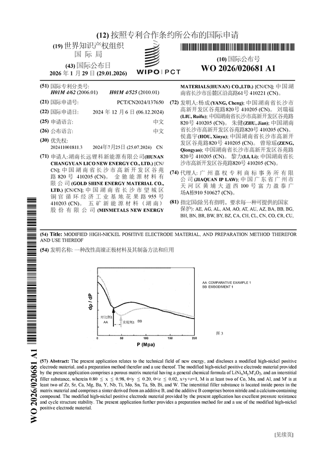 证券之星消息,根据企查查数据显示五矿新能(688779)公布了一项国际专利申请,专利名为“一种改性高镍正极材料及其制备方法和应用”,专利申请号为PCT/CN2024/137650,国际公布日为2026年1月29日。