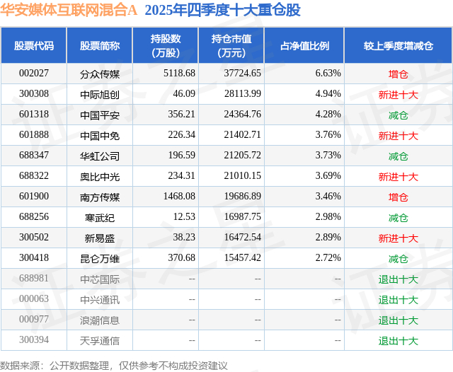 华安媒体互联网混合A的前十大重仓股如下: