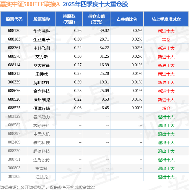 嘉实中证500ETF联接A的前十大重仓股如下: