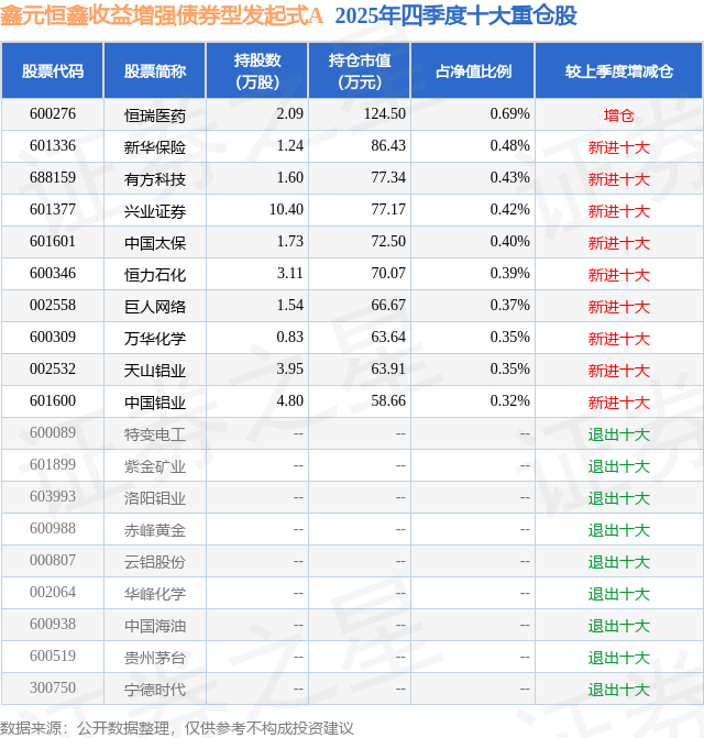 鑫元恒鑫收益增强债券型发起式A的前十大重仓股如下: